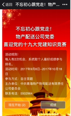 (物產(chǎn)配送公司 訊 龐玲/文)為了迎接黨的十九大勝利召開,物產(chǎn)配送公司黨委在9月8日-10月18日期間開展"喜迎黨的十九大"微信公眾平臺黨建知識答題活動(dòng)。