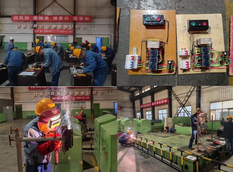 電工競賽現(xiàn)場,參賽選手面對(duì)繁瑣的配盤指導(dǎo)圖從容應(yīng)對(duì)。剪線、剝線、壓接……,一招一式都是那么的嫻熟輕快,肅靜的環(huán)節(jié)里沖刺著“濃濃的火藥味”;而維修工比賽現(xiàn)場內(nèi)卻異常熱鬧,新老電工、鉗工圍繞在設(shè)定的操作臺(tái)前,緊鑼密鼓地剪裁組料、焊接配件、清理焊渣、打磨表面,一套動(dòng)作行云流水、一氣呵成。